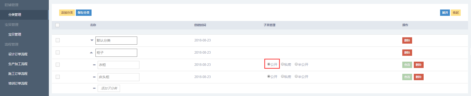 如果选择公开,则该分类下的商品其他用户都可查看