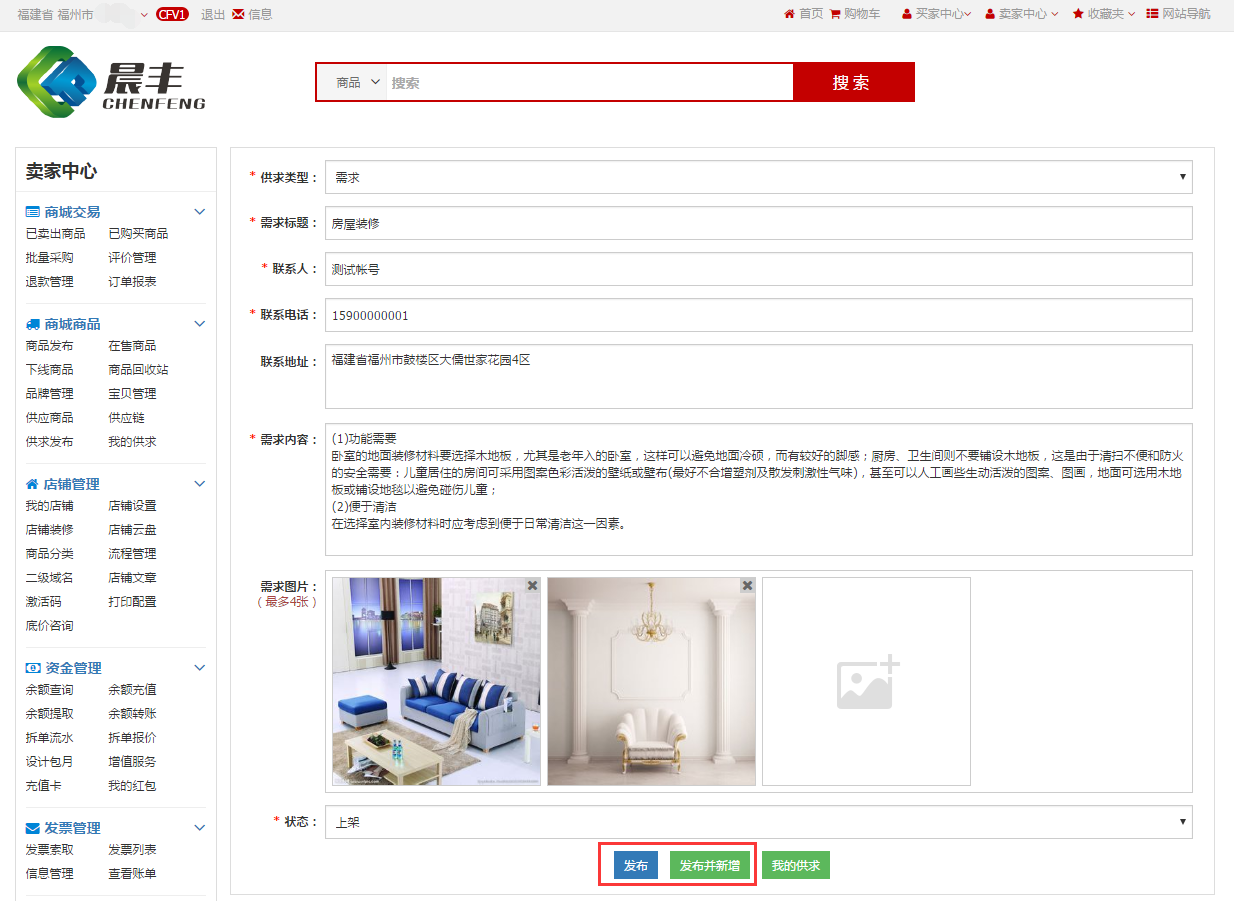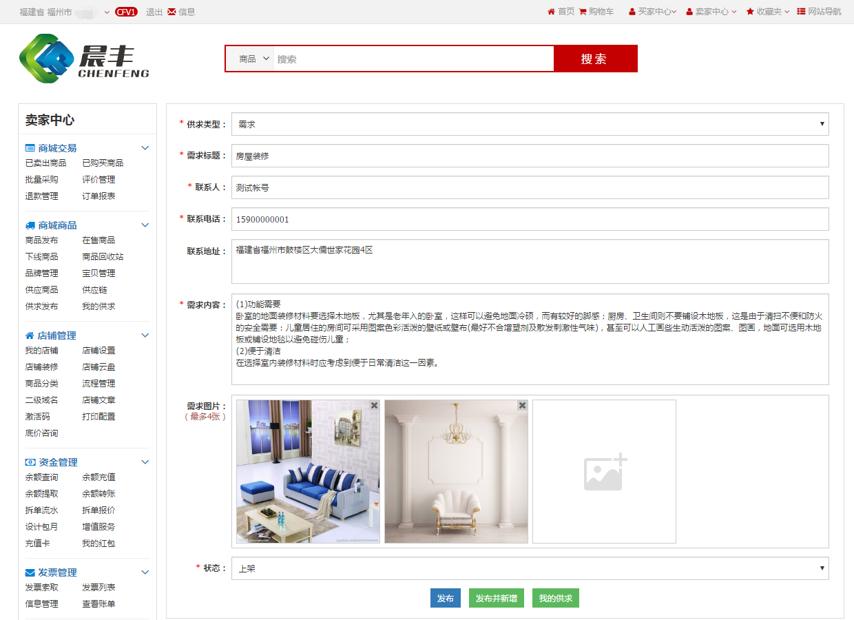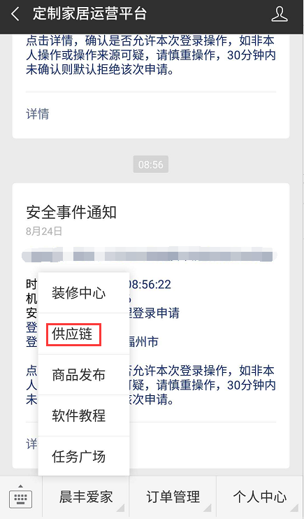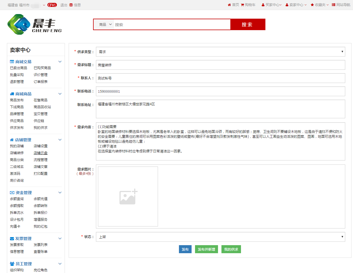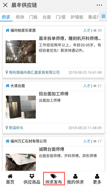 用户也可在手机端进行发布供求,在晨丰微信公众号,点击晨丰爱家-供应链