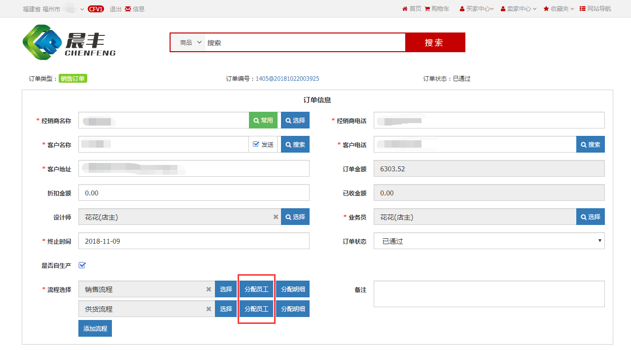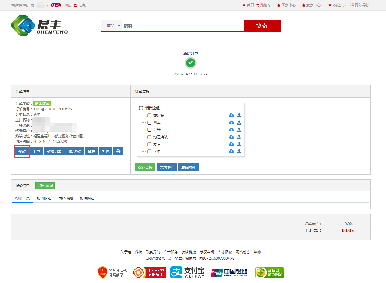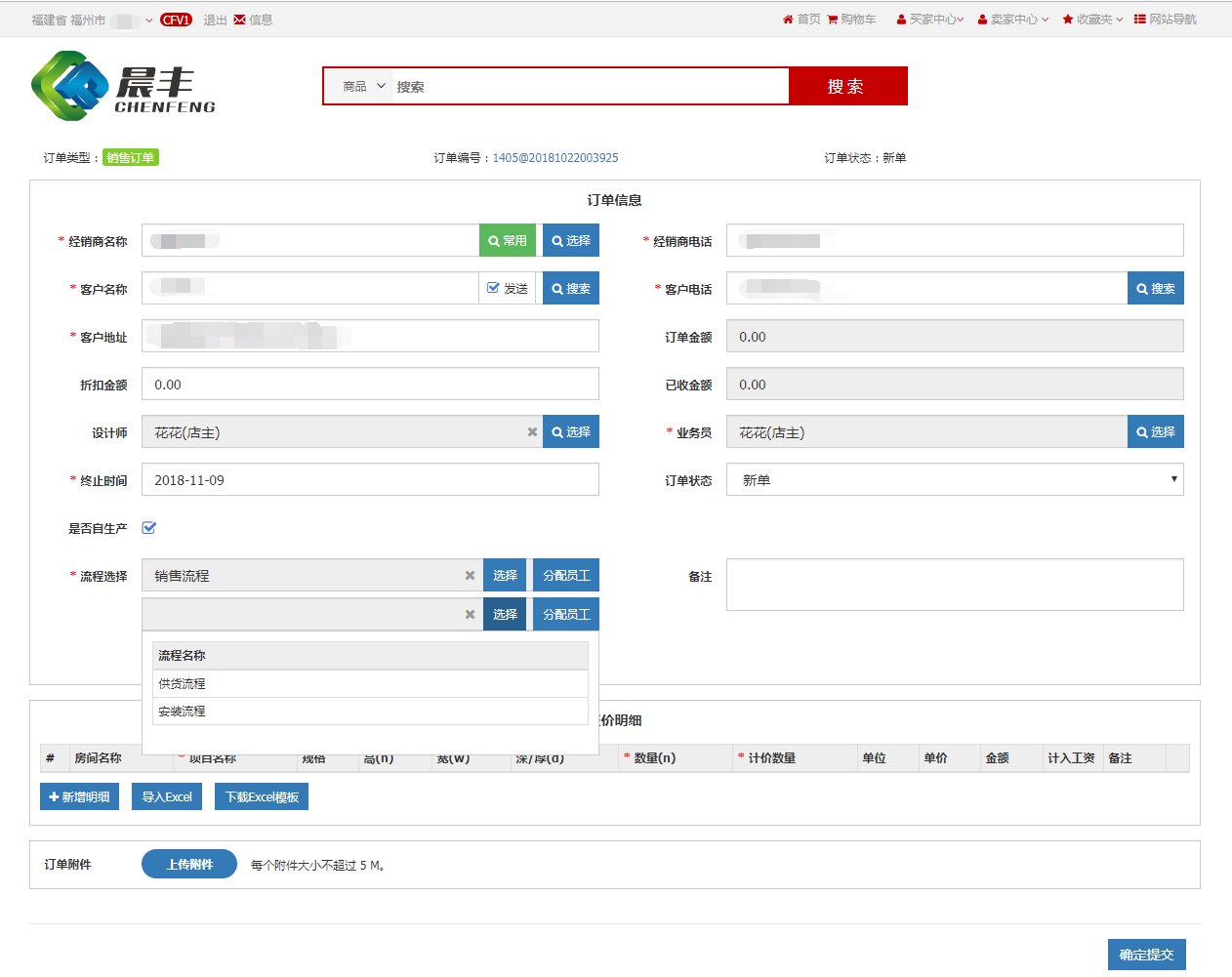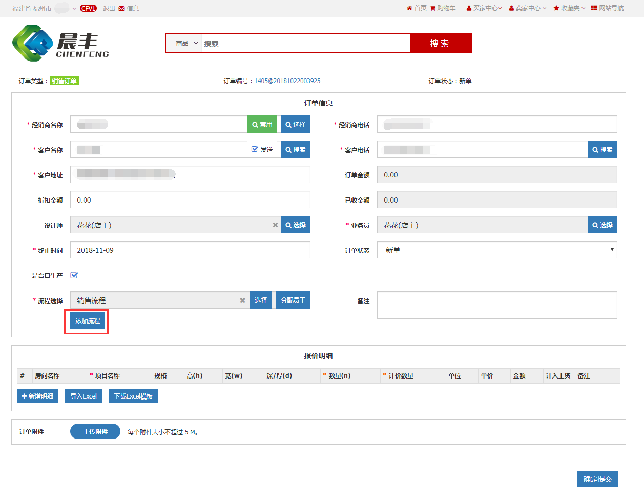 新增完订单后,点击修改订单,在修改订单页面可添加流程