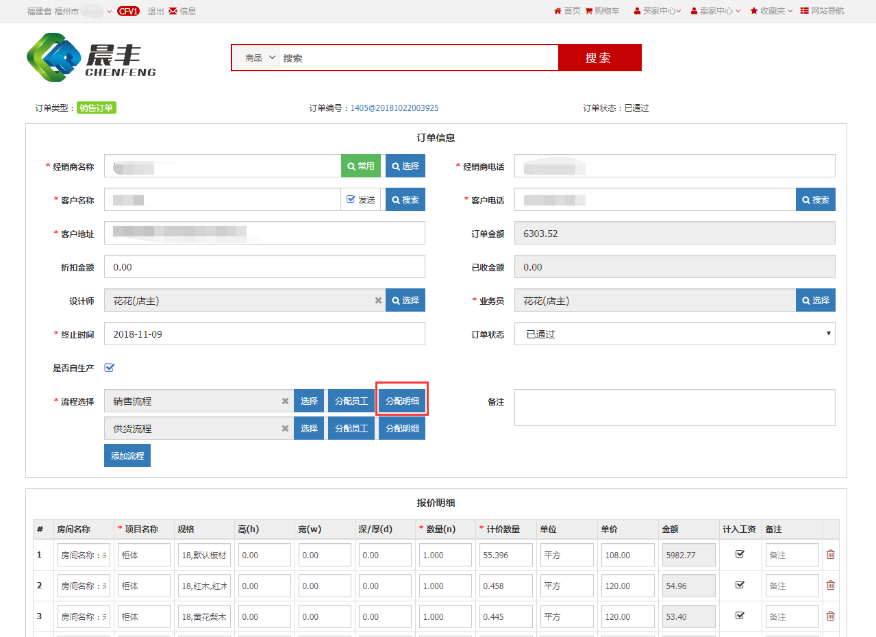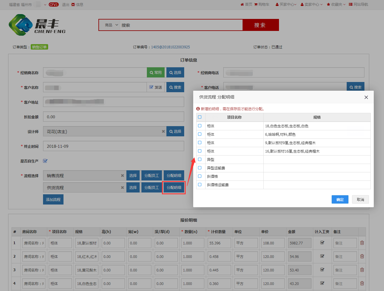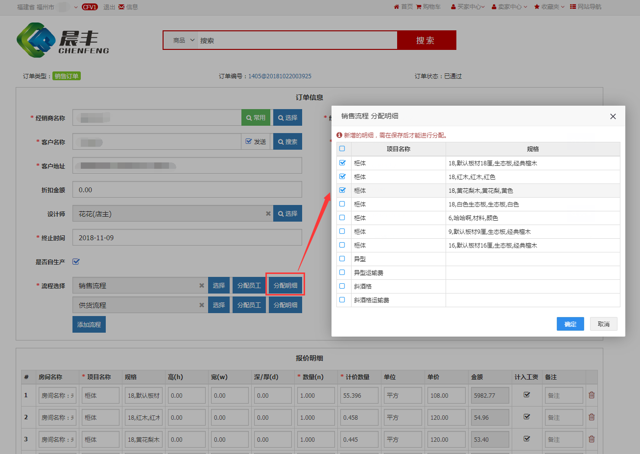用户新增完门店订单后,可对订单进行多流程设置;多流程即用户可根据需要对不同项目明细设置不同的流程
