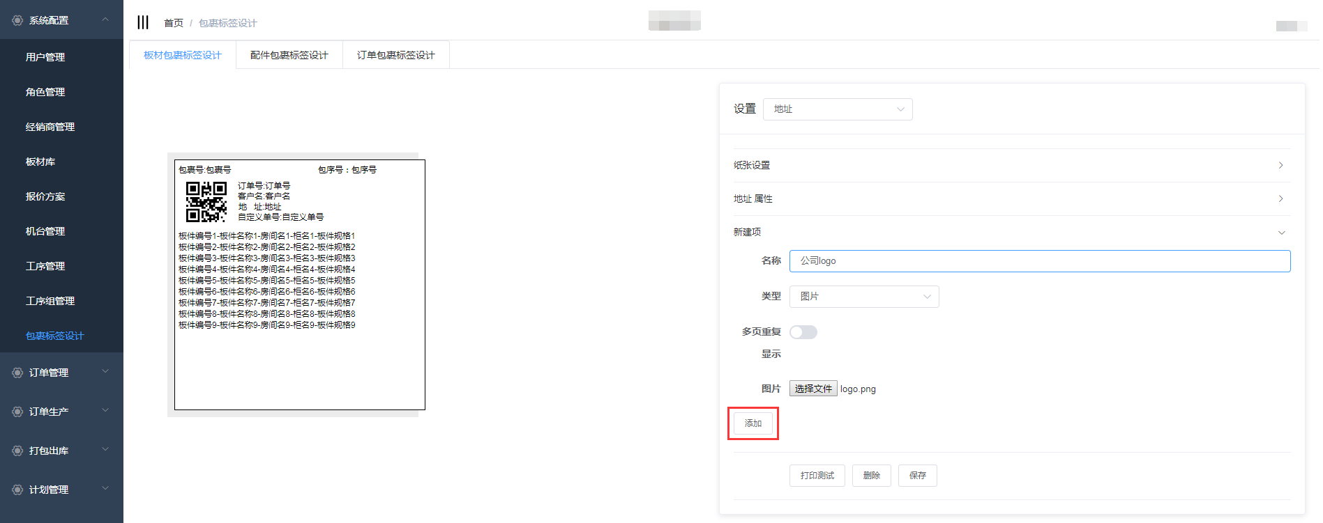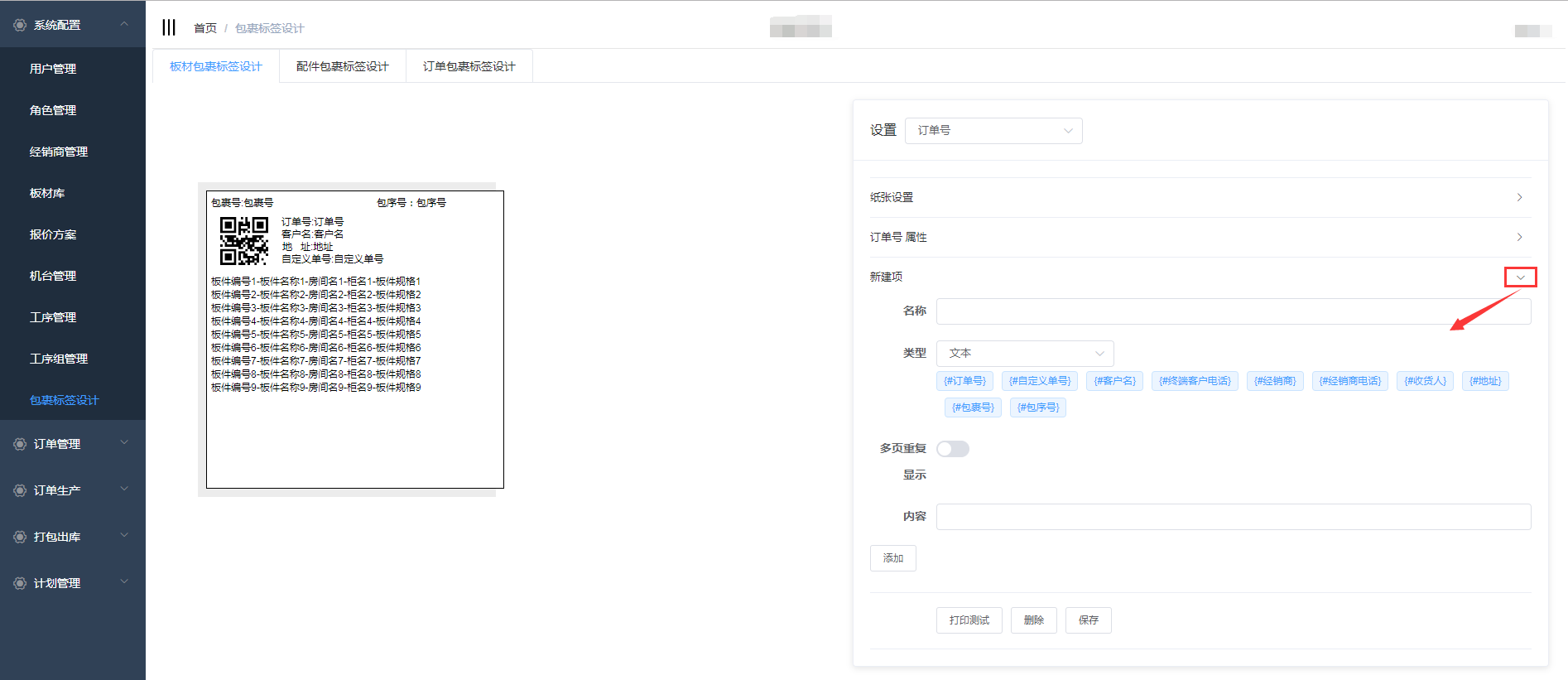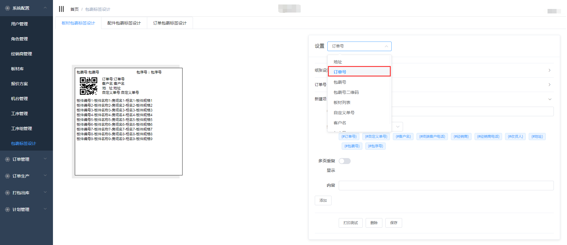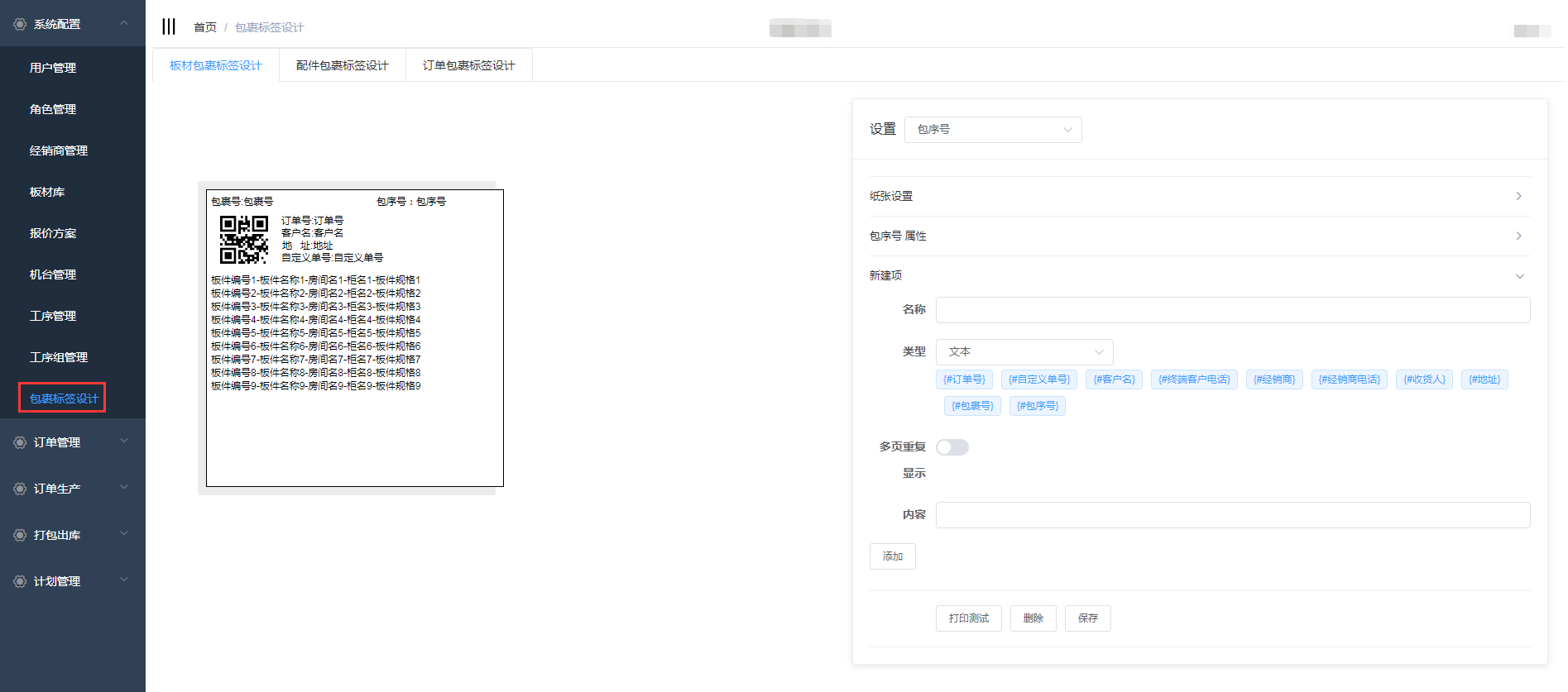 在包裹标签设计中包含了板材包裹标签设计、配件包裹标签设计、订单包裹标签设计,三个页面的设计操作一致,下面以板材包裹标签设计为例详细介绍操作
