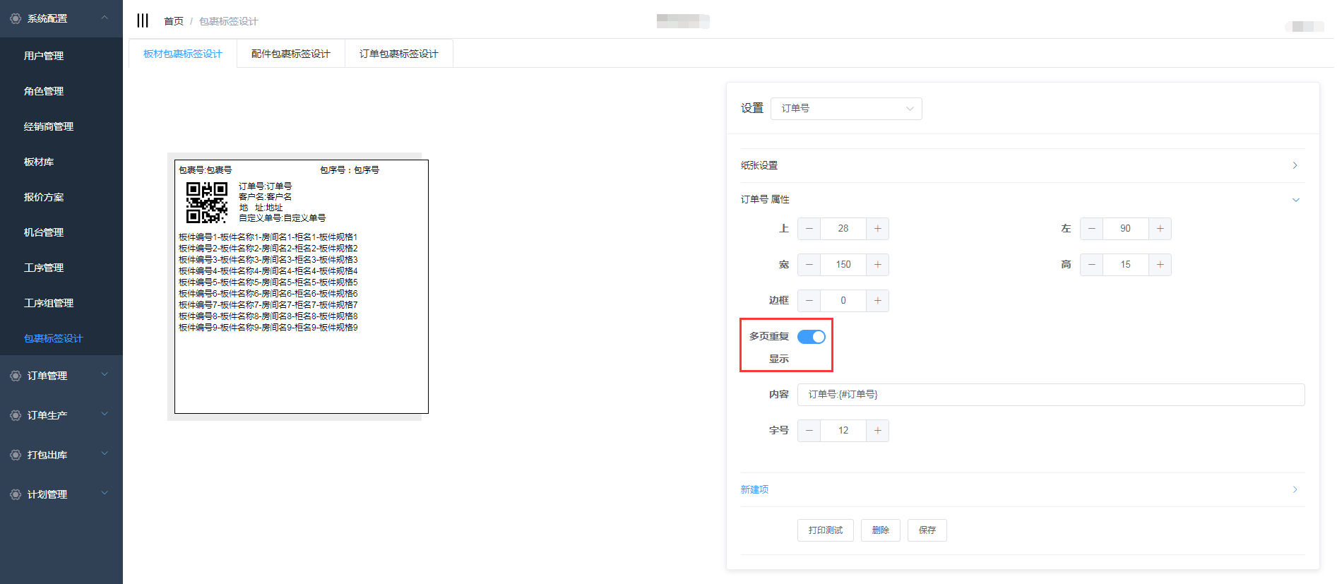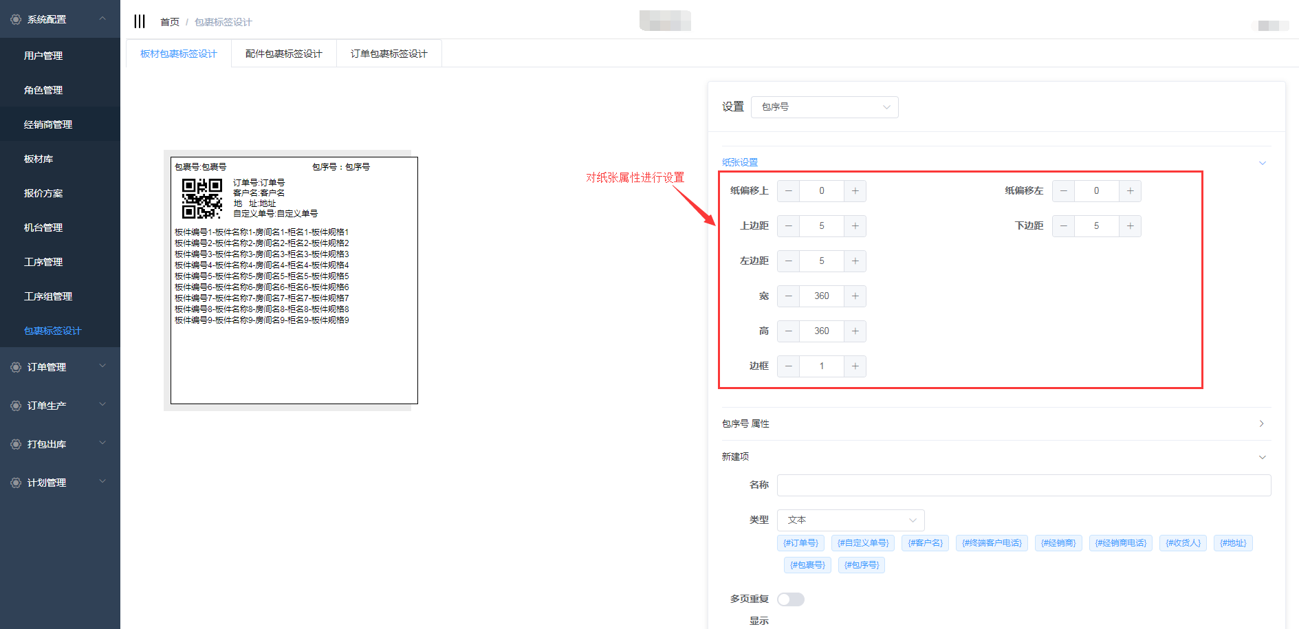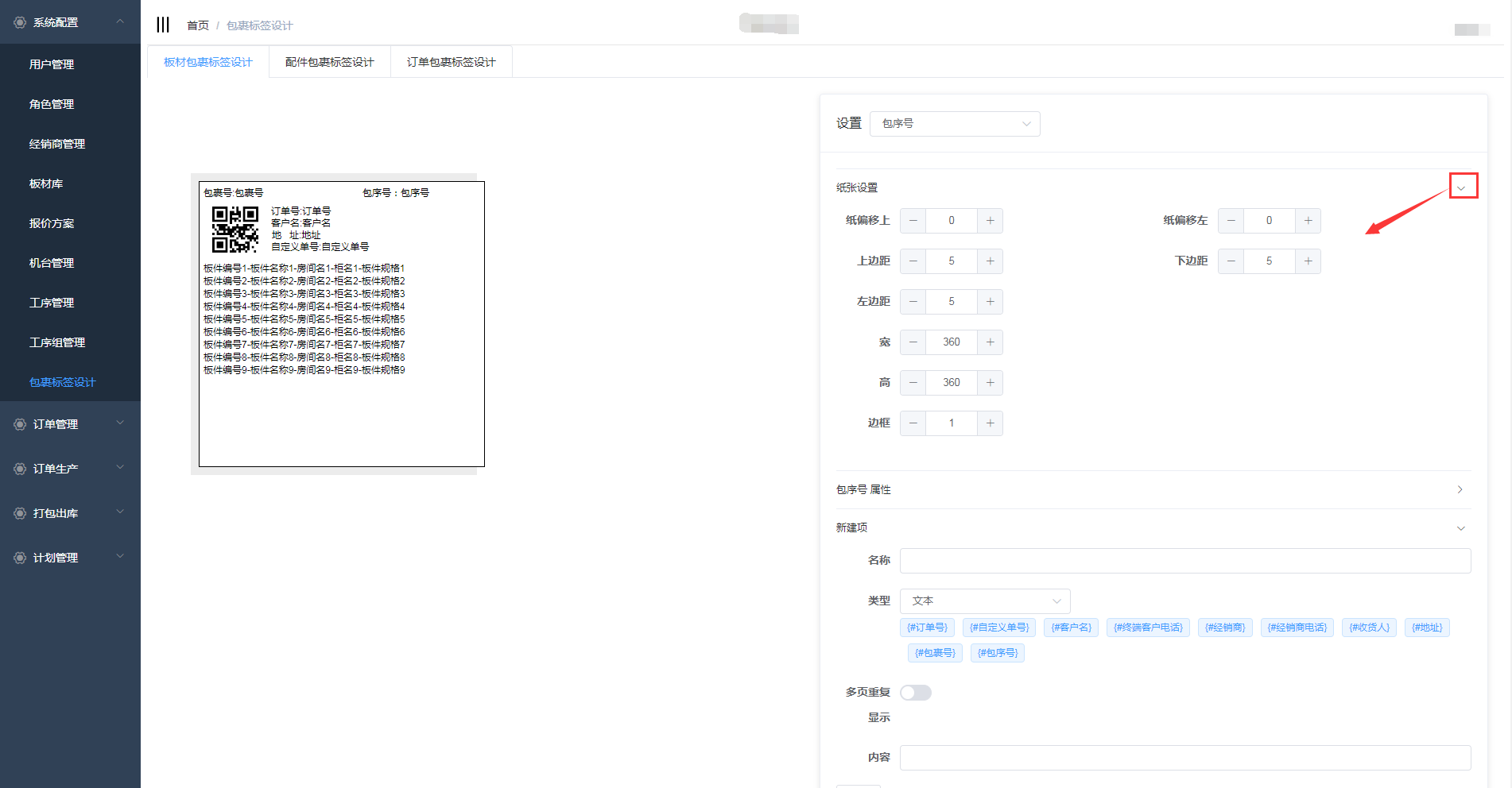 在包裹标签设计中包含了板材包裹标签设计、配件包裹标签设计、订单包裹标签设计,三个页面的设计操作一致,下面以板材包裹标签设计为例详细介绍操作