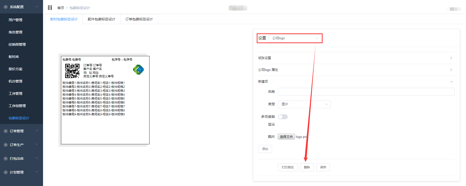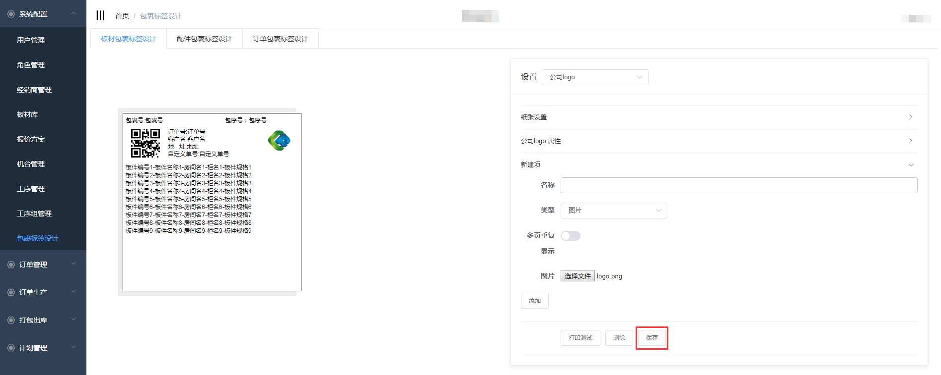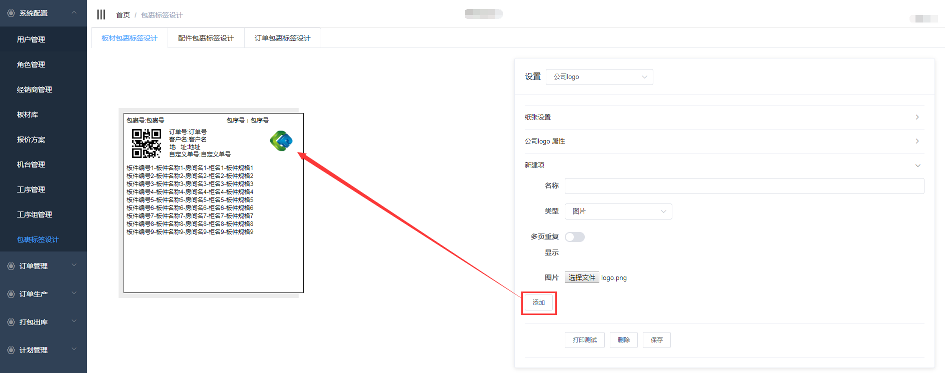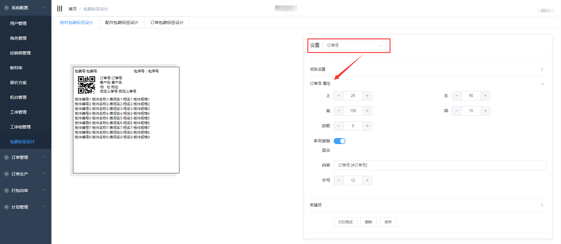 在包裹标签设计中包含了板材包裹标签设计、配件包裹标签设计、订单包裹标签设计,三个页面的设计操作一致,下面以板材包裹标签设计为例详细介绍操作