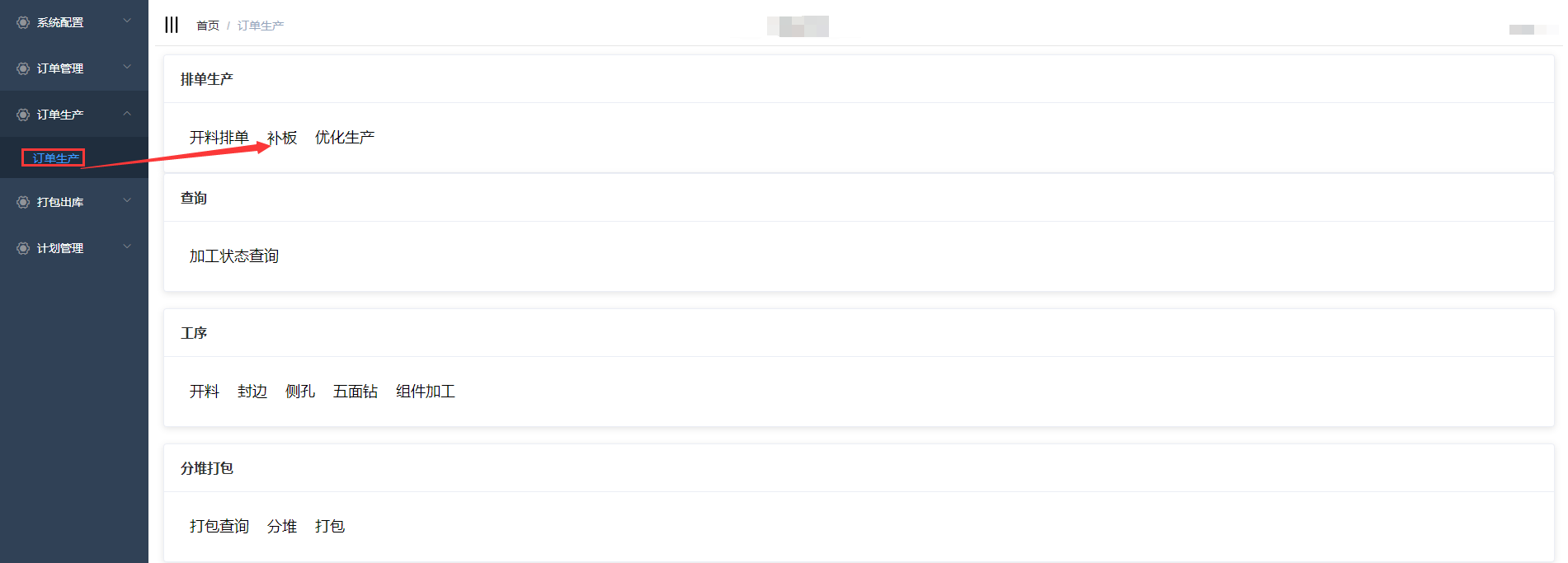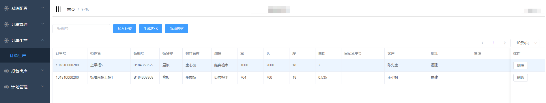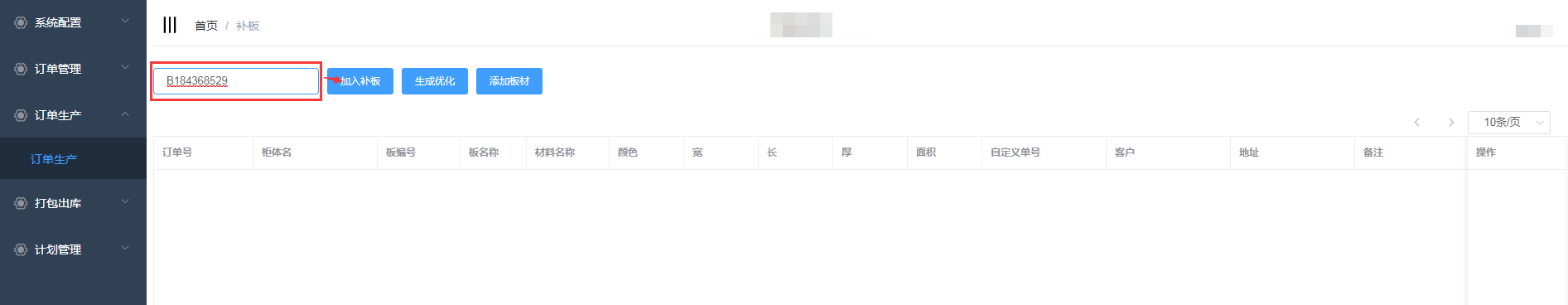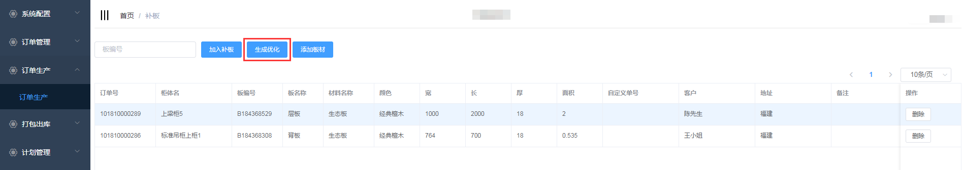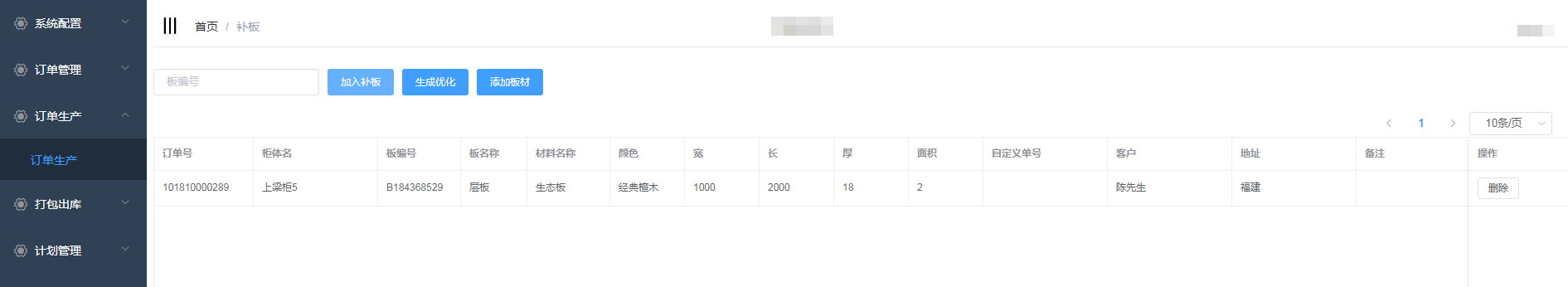 如果用户开启了网页端的优化功能,那么在生产管理中可以使用补板功能