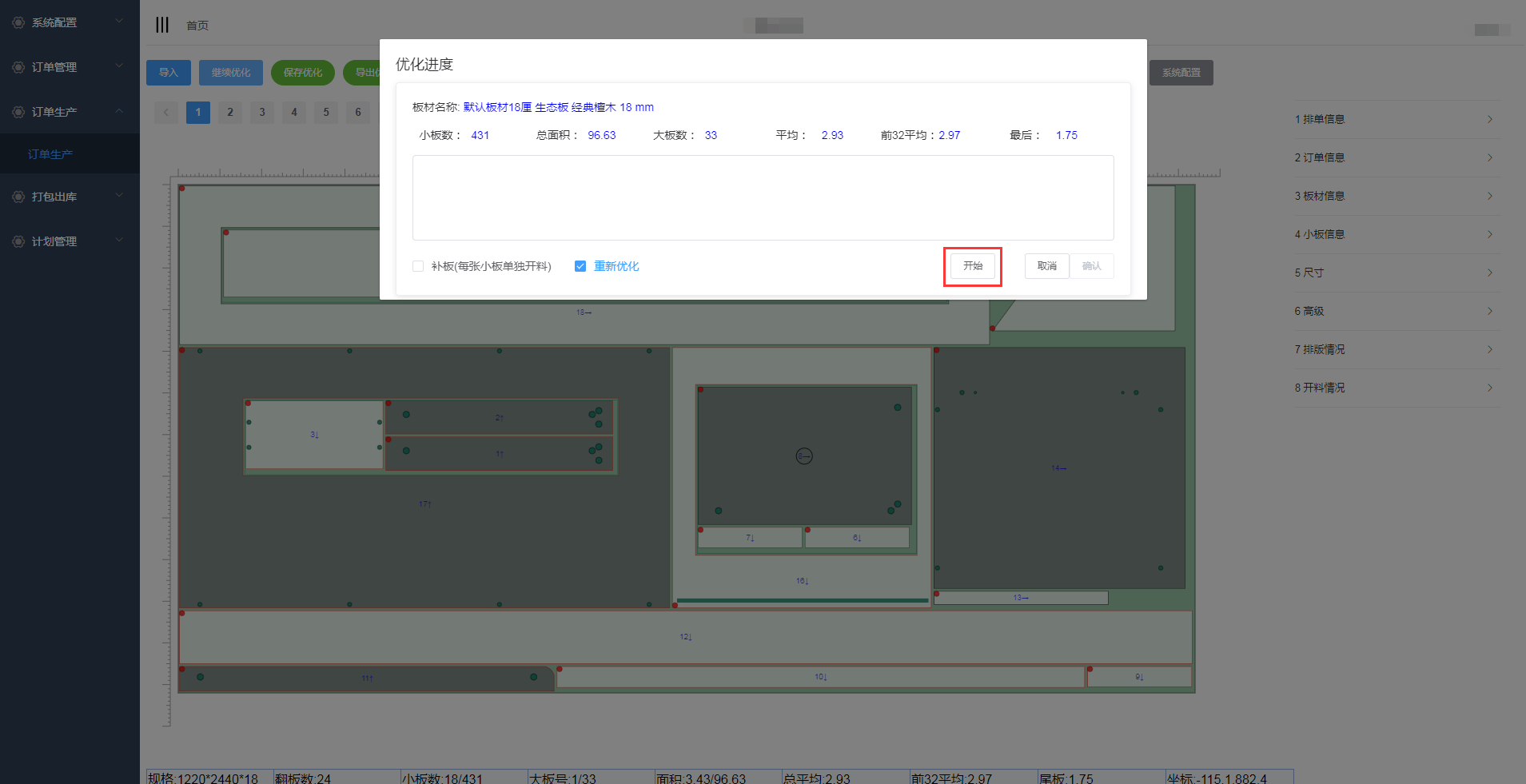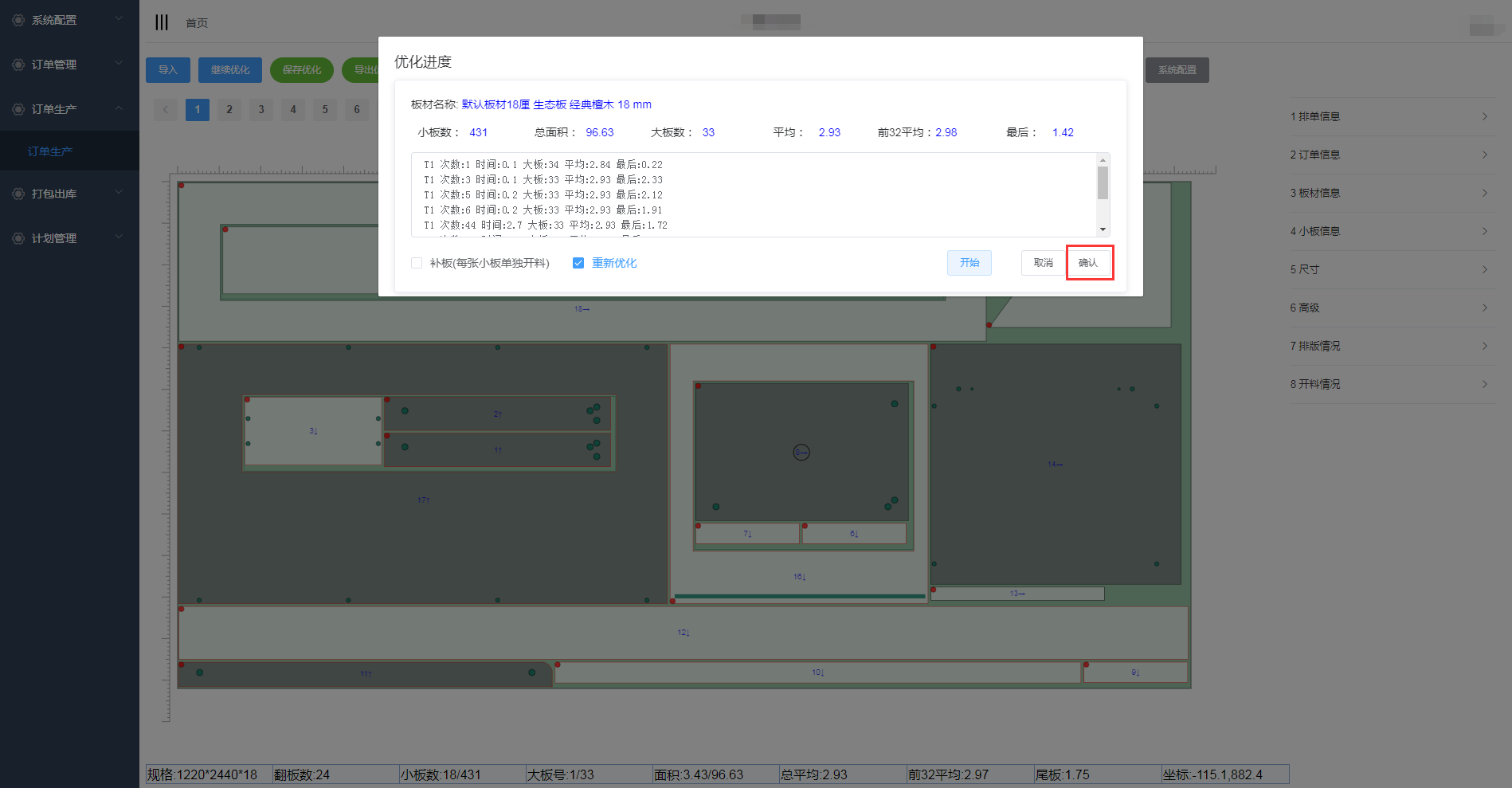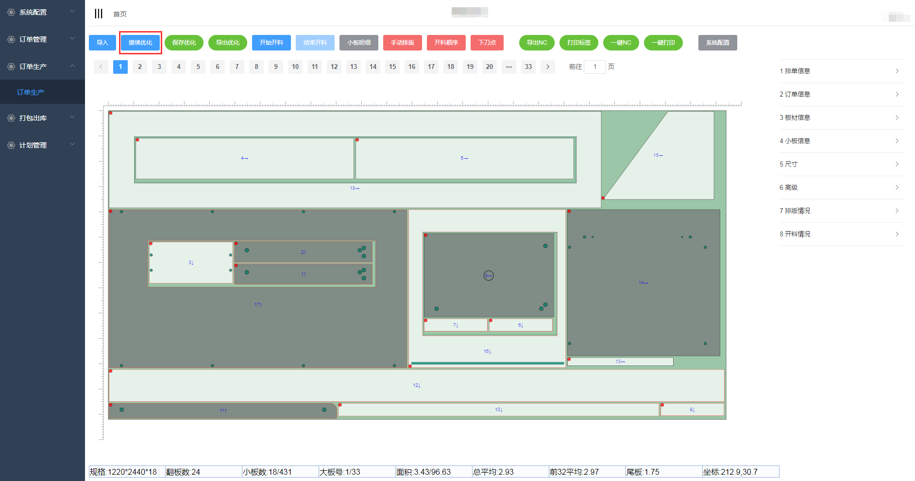 在优化排版页面,点击继续优化可对板件进行再次优化