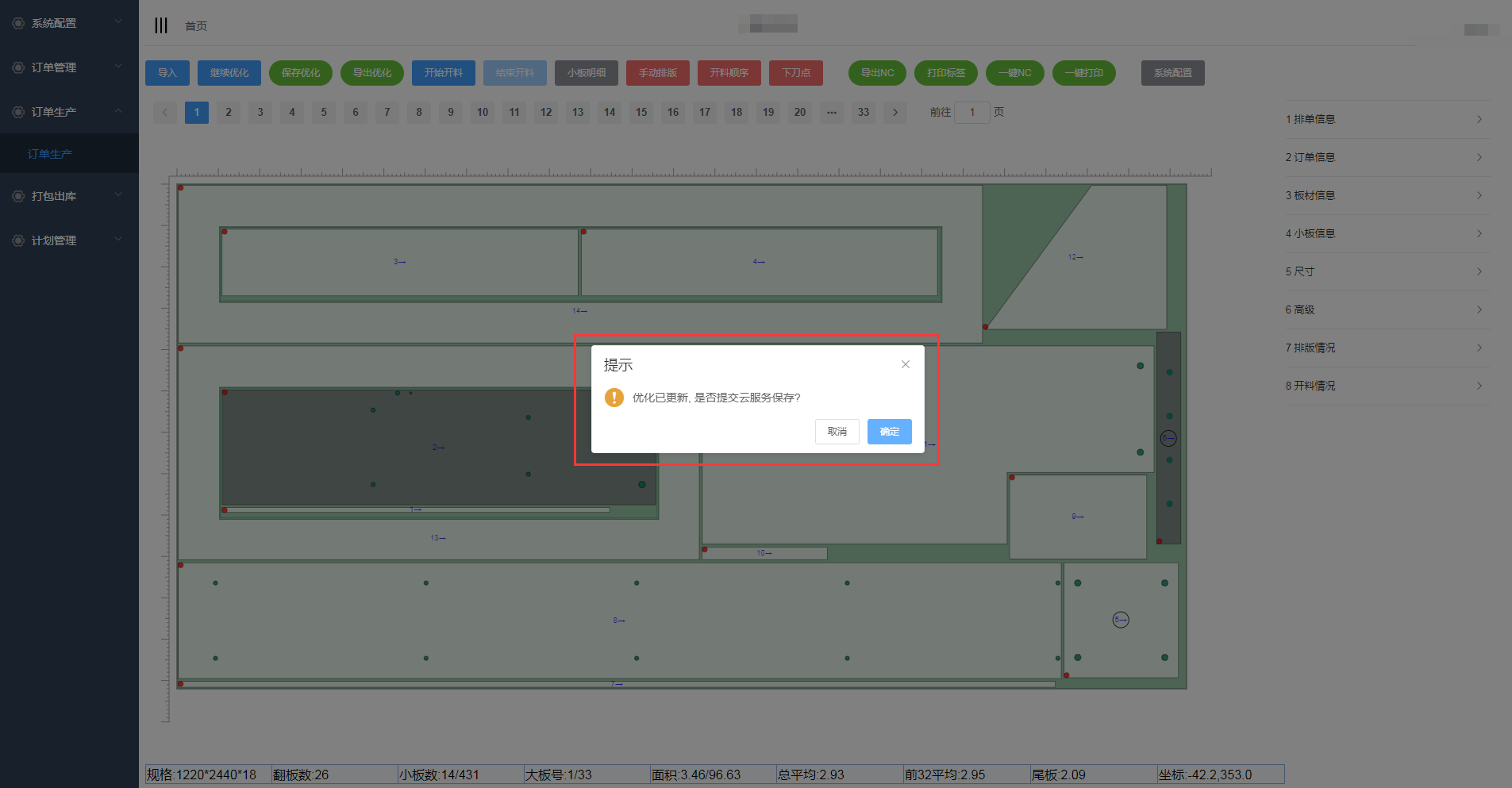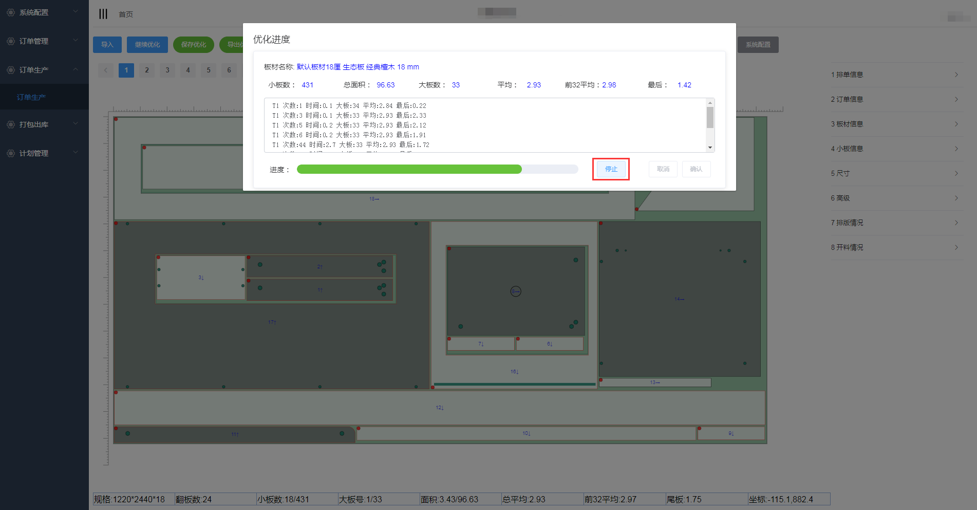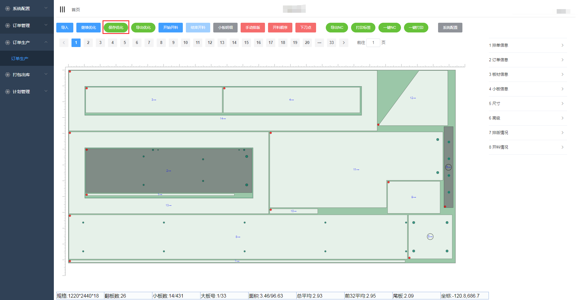 在优化排版页面,点击继续优化可对板件进行再次优化