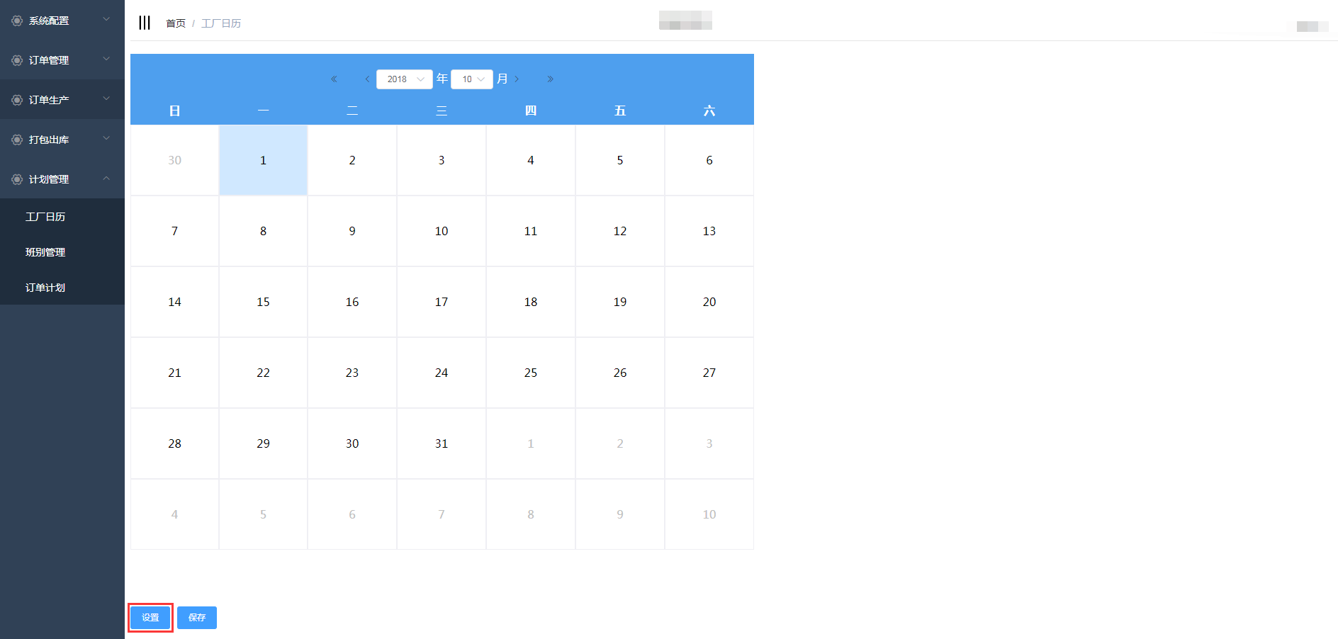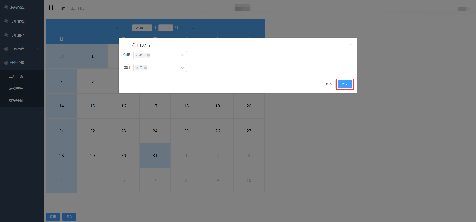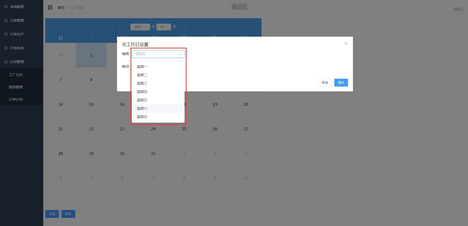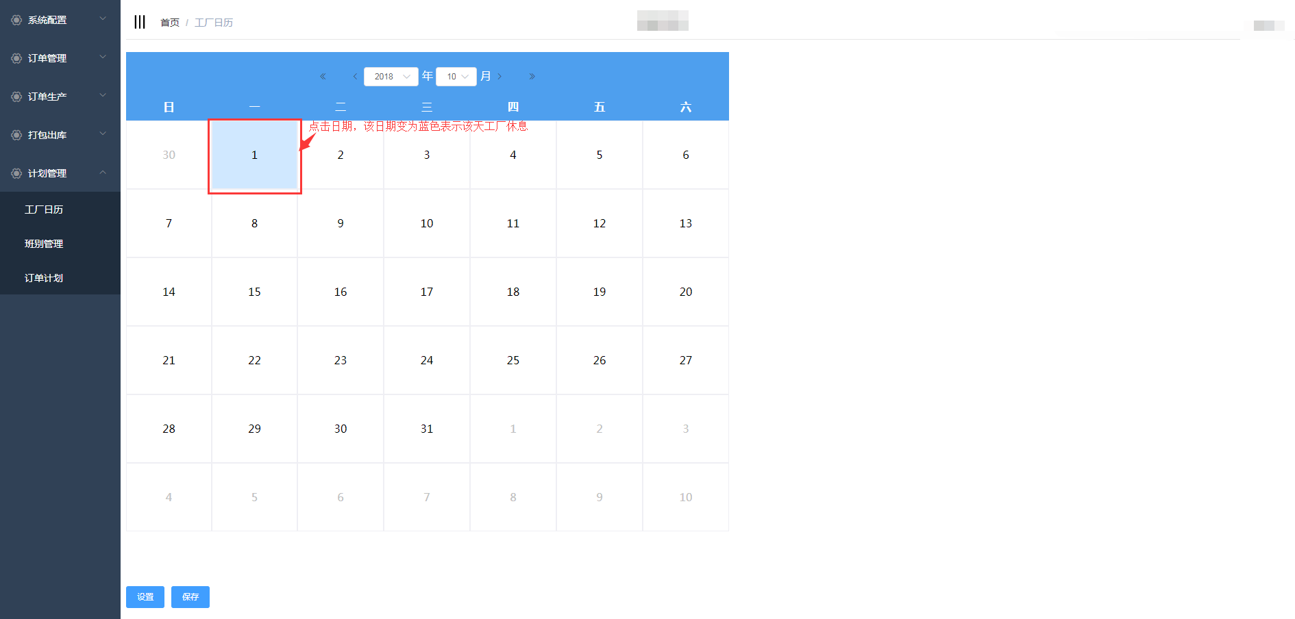 点击计划生产-工厂日历进入工厂日历页面,设置工厂的上班时间和休息时间