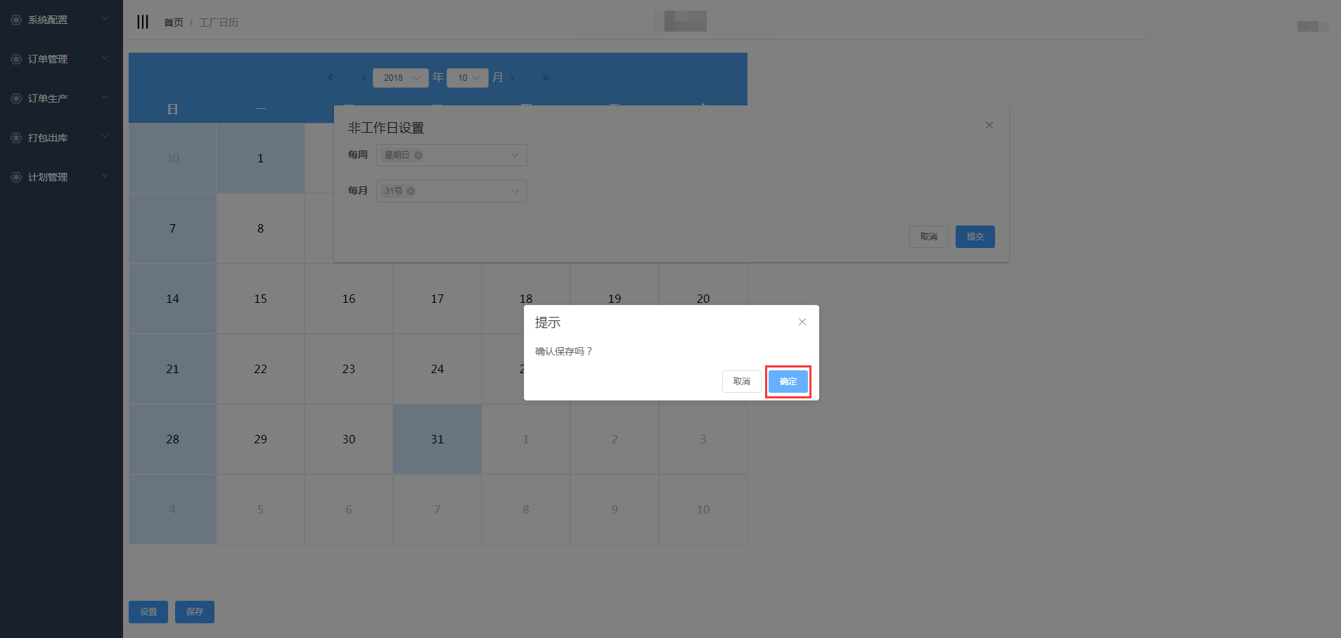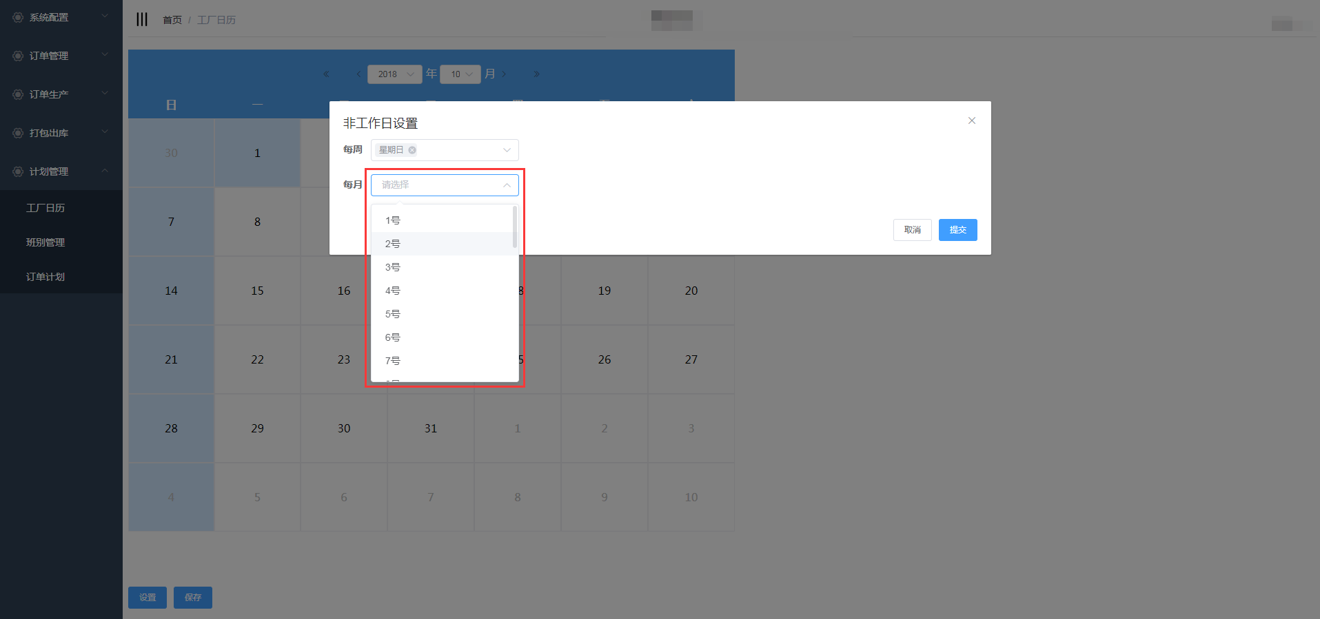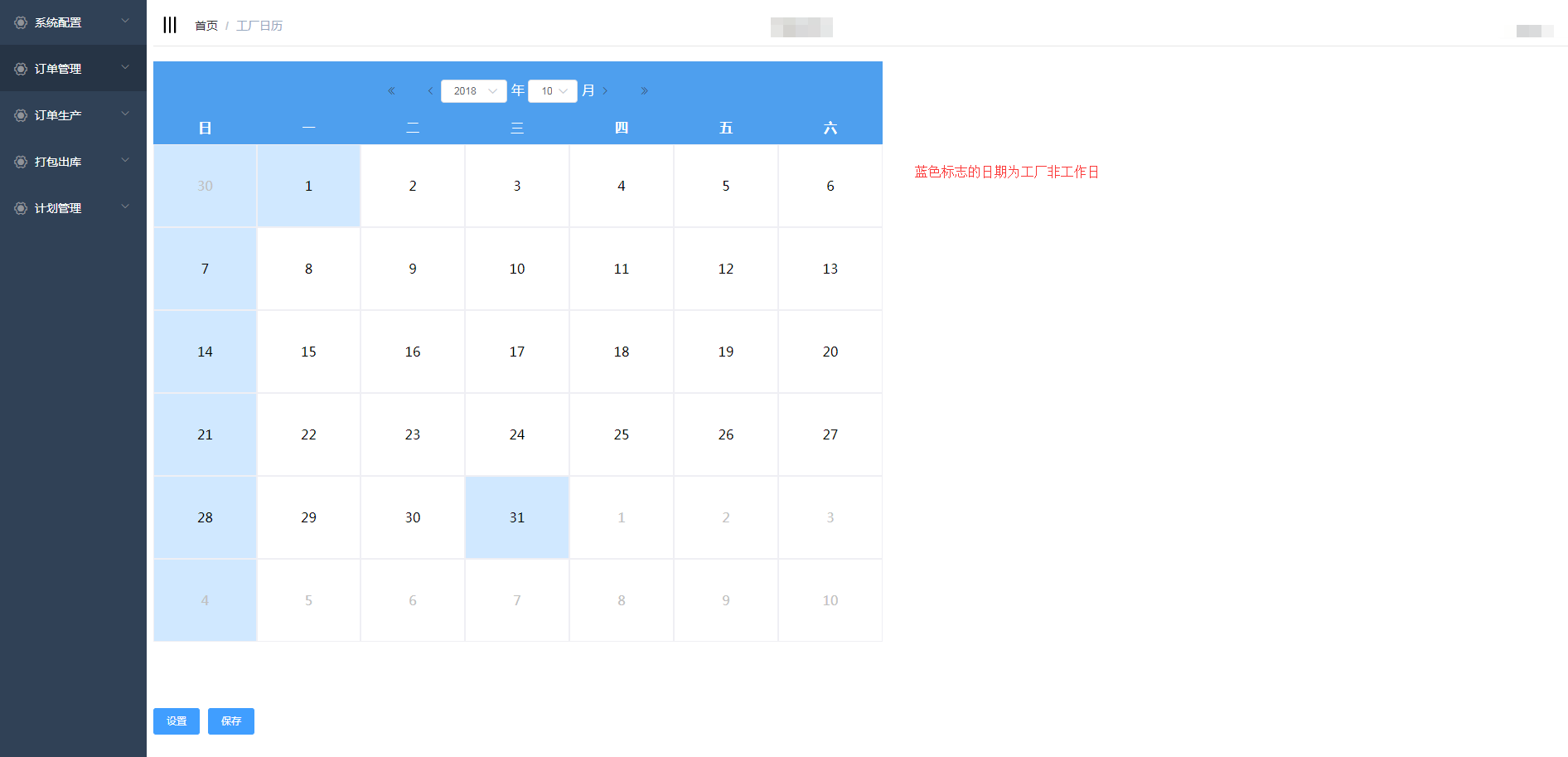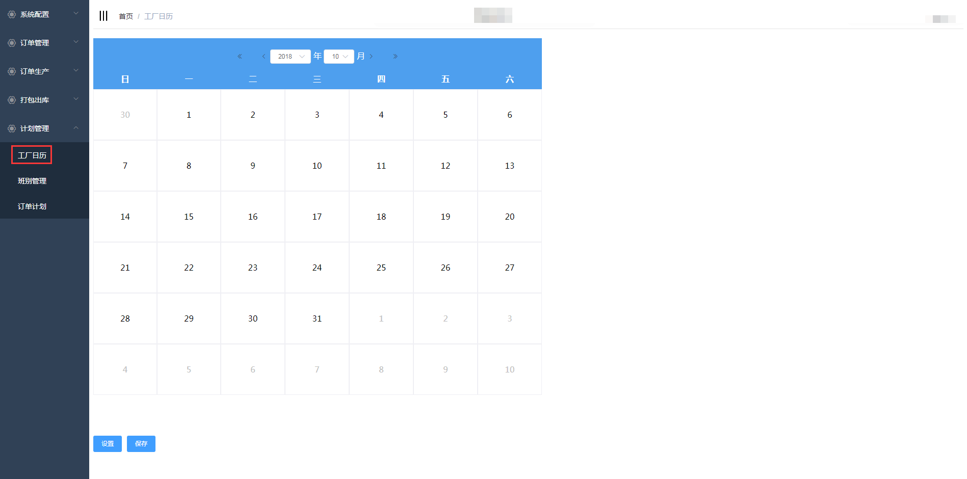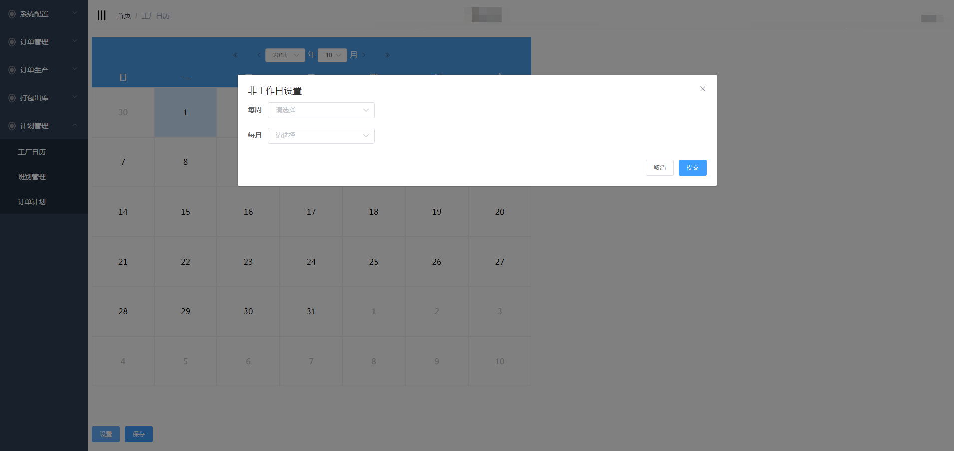 点击计划生产-工厂日历进入工厂日历页面,设置工厂的上班时间和休息时间
