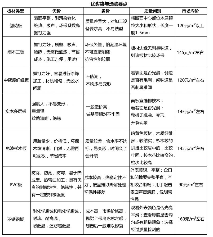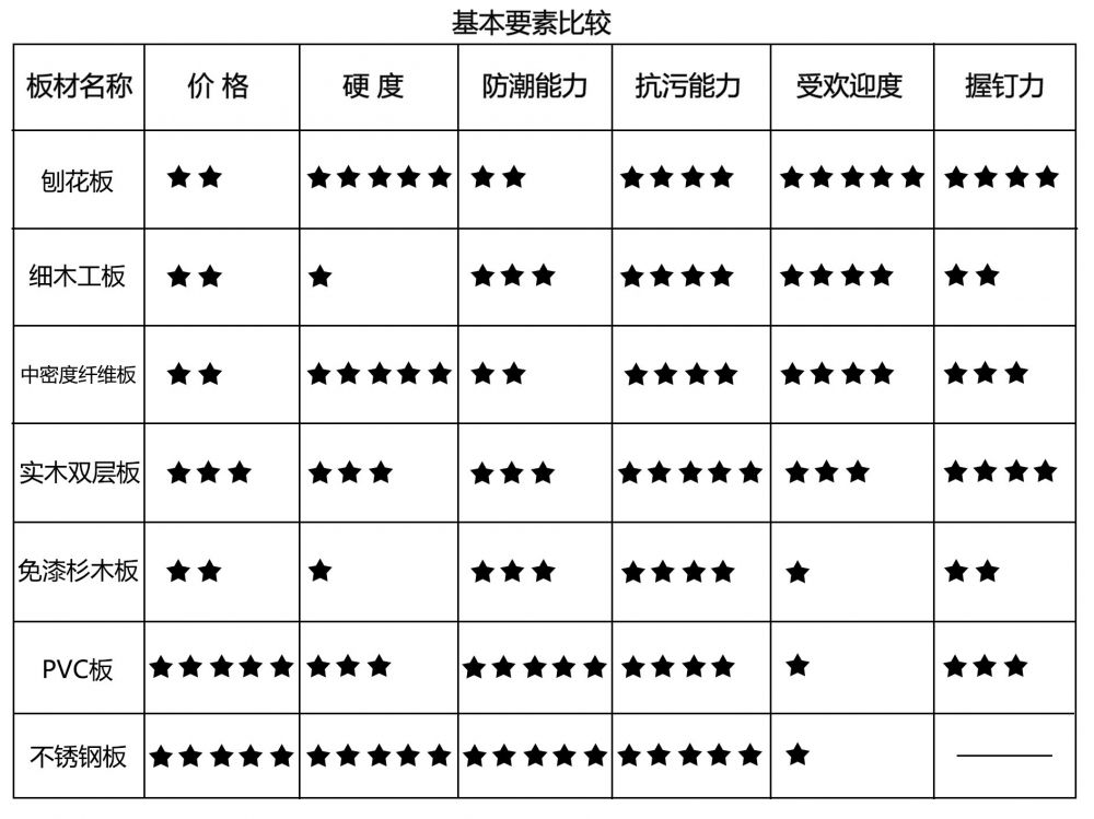 以上介绍的是目前市面上比较常用的橱柜板材,在大致了解其基本制作原理、名称叫法、产品特性及防火、隔热、隔音、环保的相关要素后,还可通过以下表格,对这七款板材进行更细致的差异了解。