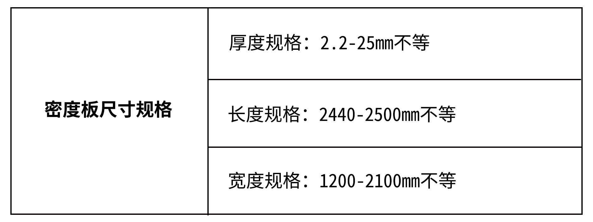 密度板虽然工艺流程颇为繁琐,但易于加工的特性,增加了密度板被定制多样尺寸的可能,日益花样繁多的消费者需求,使密度板因用途、或是消费者意愿诉求上的不同,有着各不相同的尺寸,其大致尺寸规格范围如下: