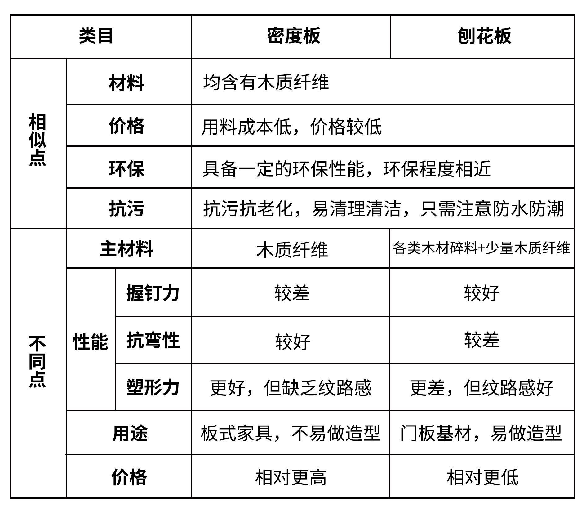 密度板与刨花板有着不少相似之处,共有的优势也是让消费者踌躇选择哪款板材的主要原因。但是,既为两款不同的板材,必然存在着不同之处,接下来为大家解析一下它们的不同点: