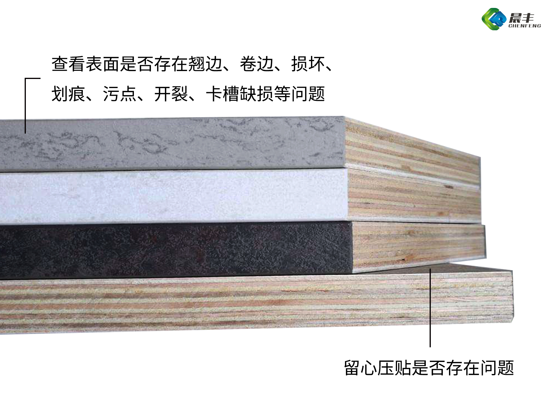 (2)查看表面是否存在翘边、卷边、损坏、划痕、污点、开裂、卡槽缺损等问题;