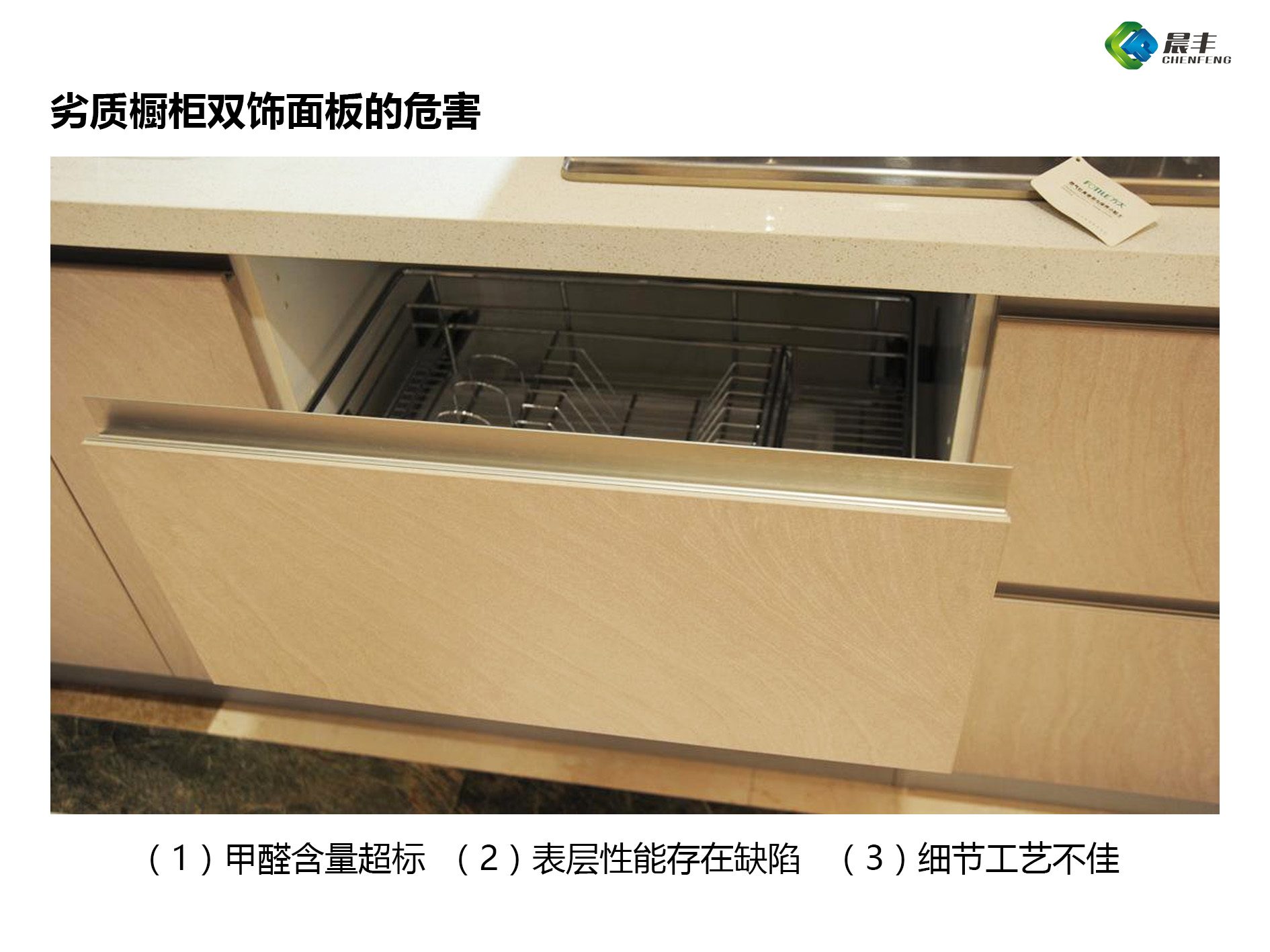 在第(2)点中,我们提到了表层加热加压工艺,除此之外,还存在外观上面的细节工艺。劣质橱柜双饰面板材可能会存在污斑、压划痕、孔隙、色泽不均匀、鼓泡现象、缺损现象等,废料可回收可能性大大降低,提高了环境运营成本。