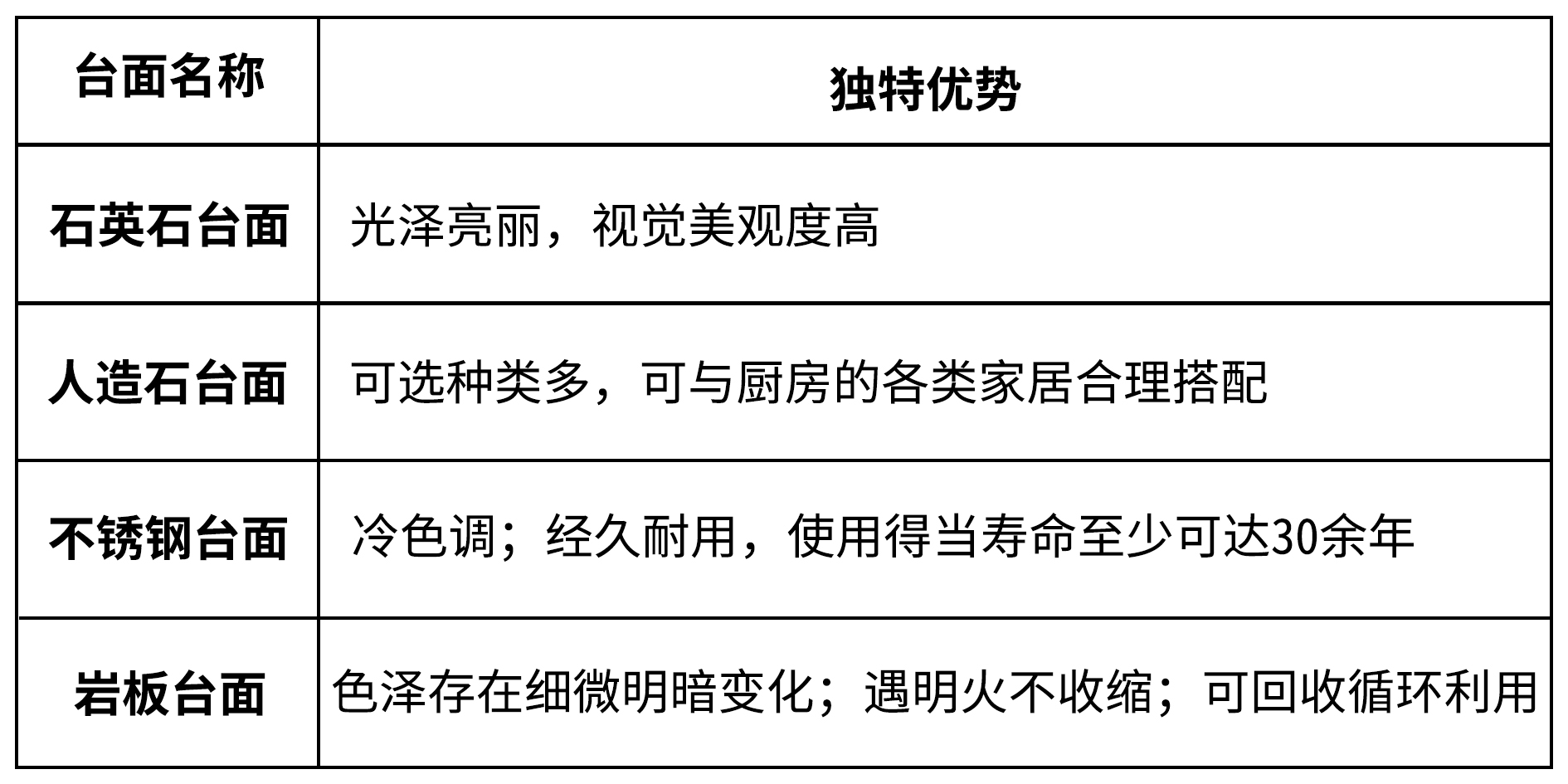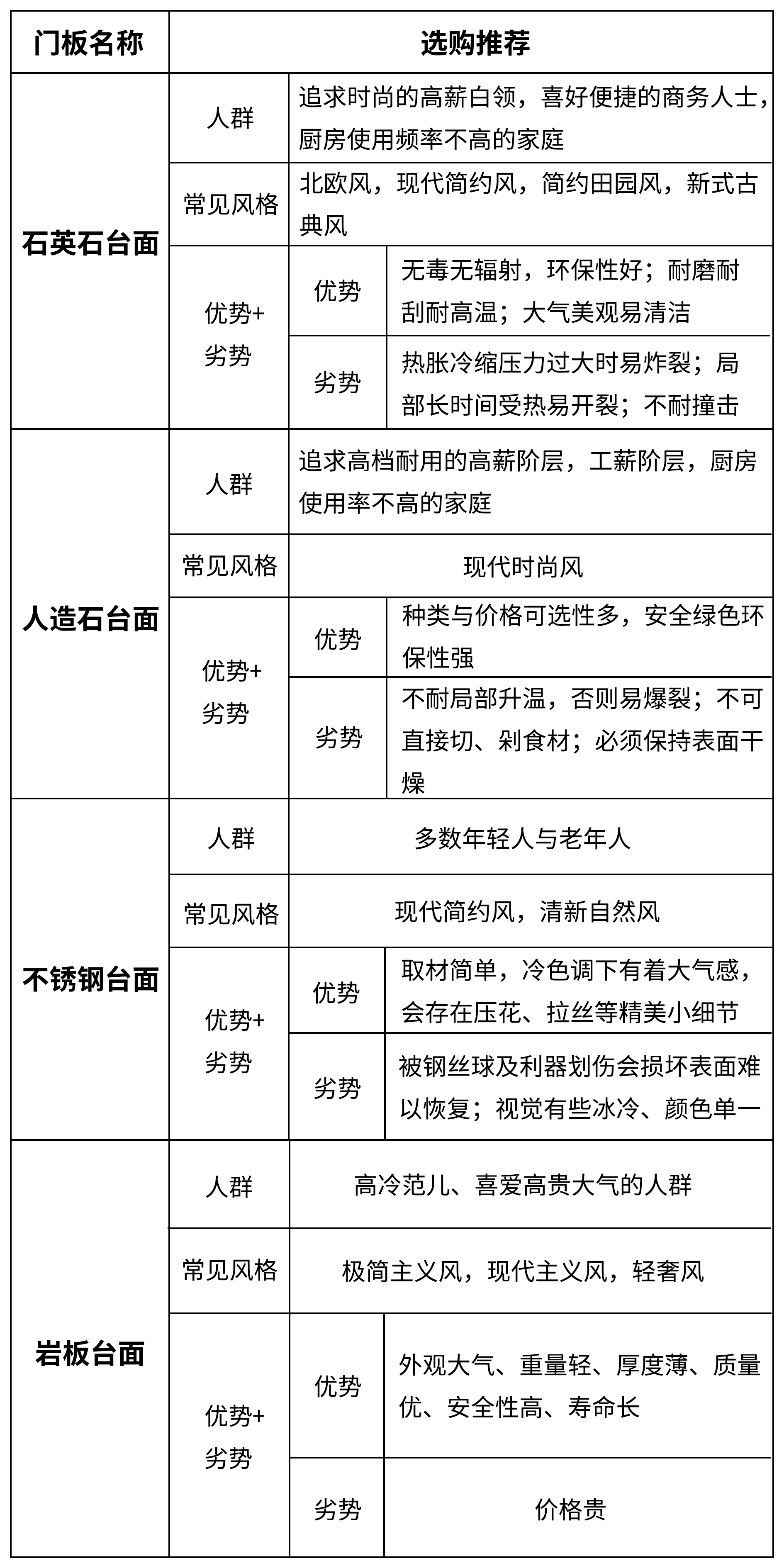 四大橱柜台面有着鲜明、各不相同的独特优势,但每款台面都有最适合的选购要素。根据其独特优势,其它要素不论,我们可以大概总结出以下结论: